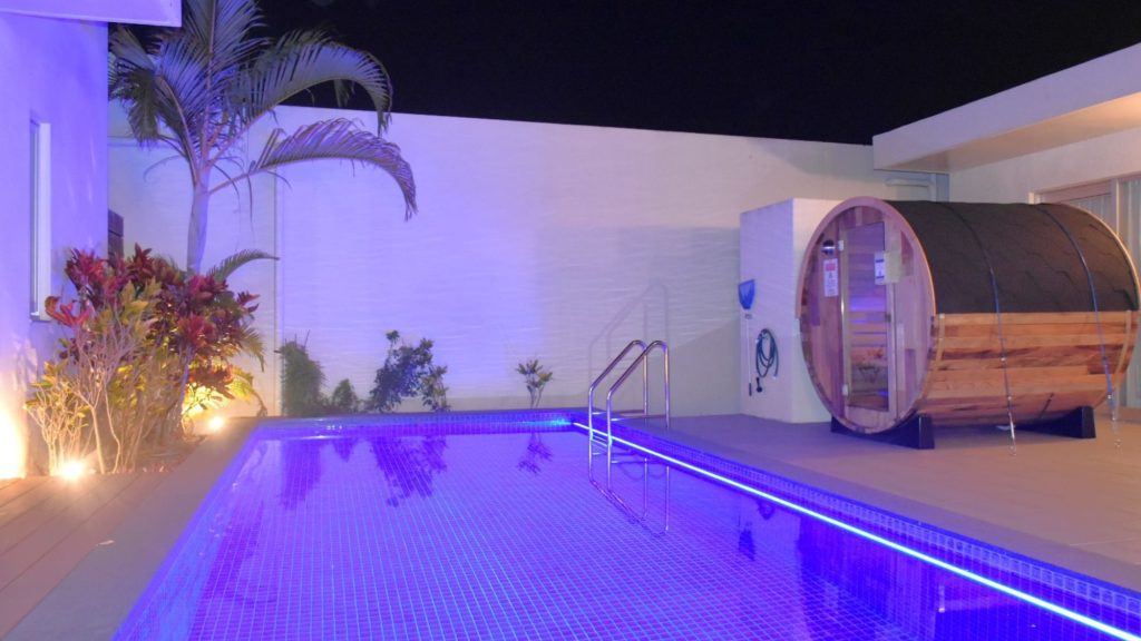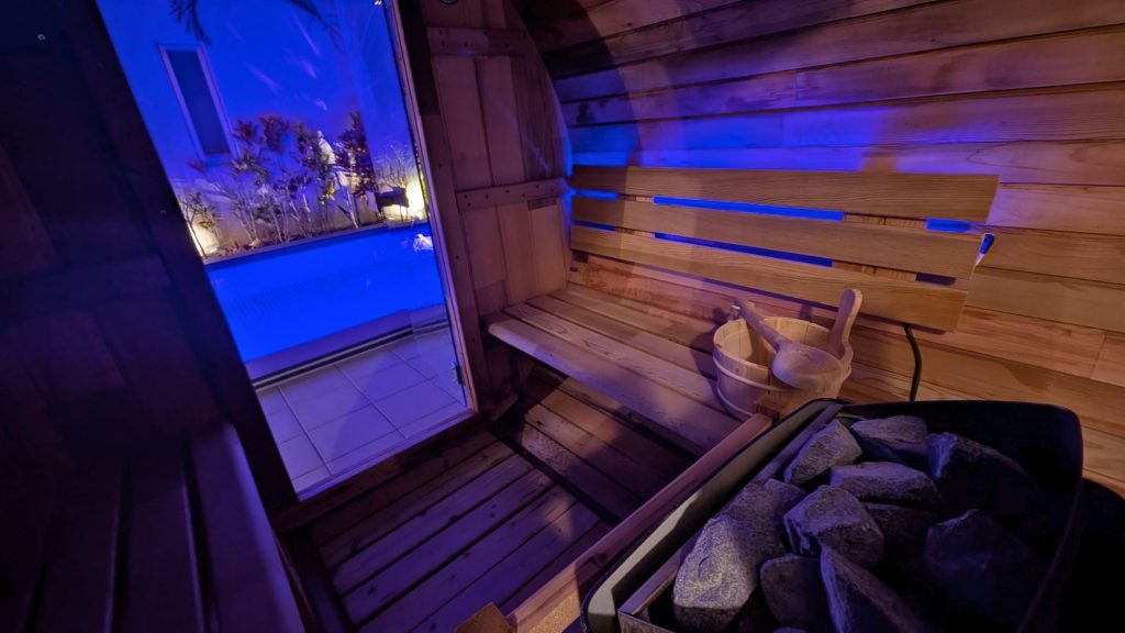 プールサイドに天然木を使用した本格的なバレルサウナ。
